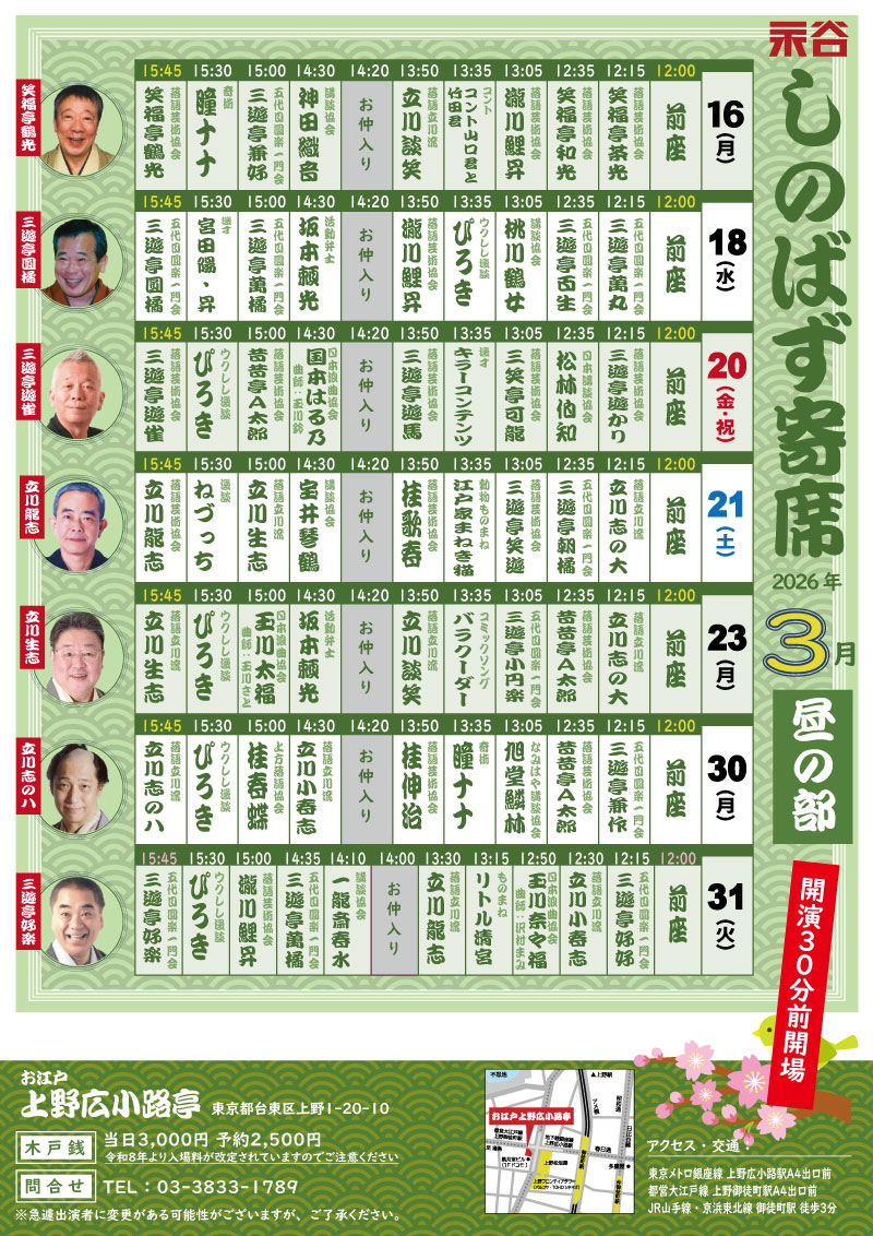 ・お問合せ アクセス 045-212-5555 (平日11時~13時/15時~17時) info@access.promo- 3月23日(月) 「しのばず寄席」昼の部/東京・上野広小路