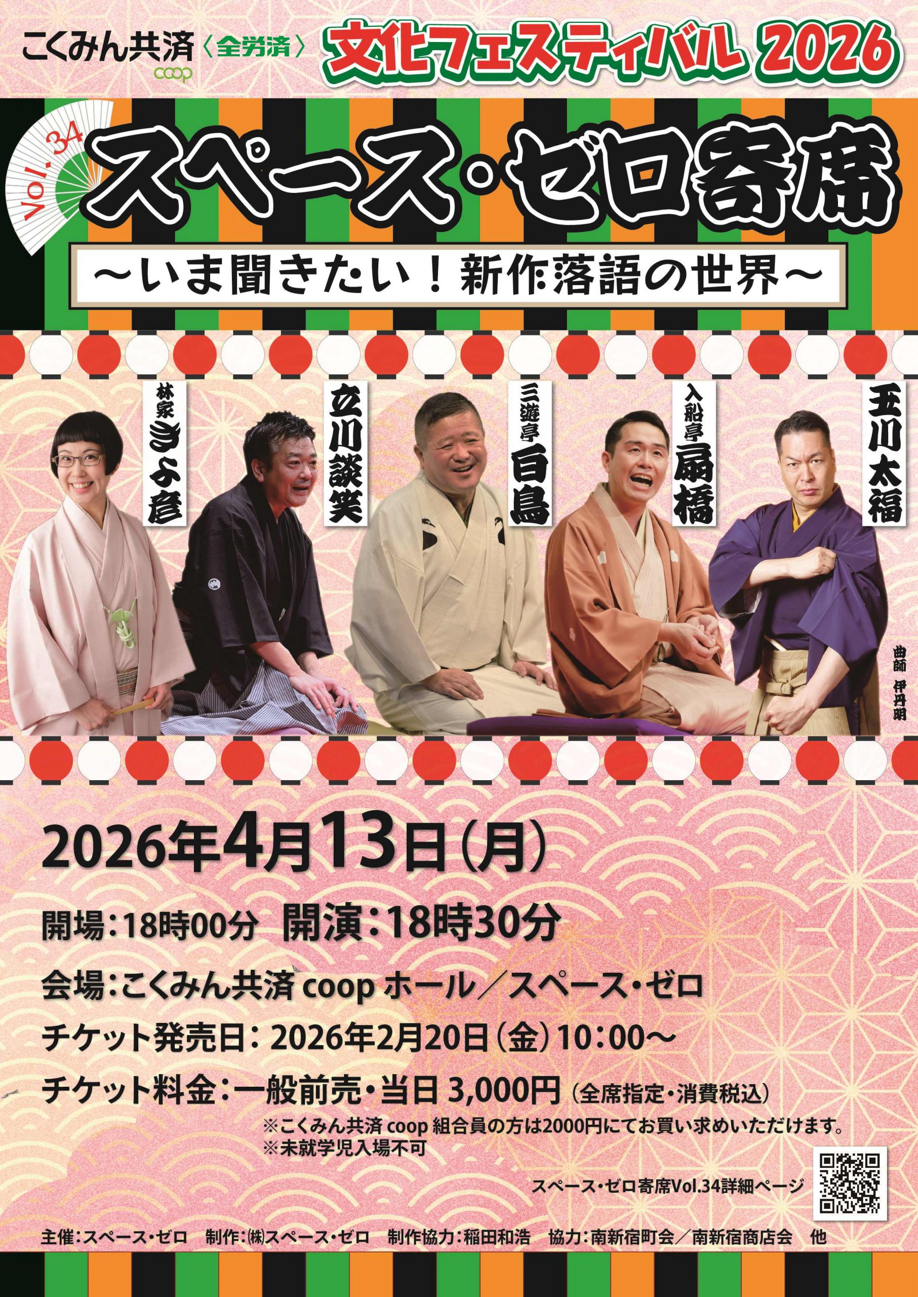 ・お問合せ 立川企画 03-6452-5901(平日10:00~18:00)- 4月13日(月)「スペース・ゼロ寄席 vol.34 ~いま聞きたい!新作落語の世界~」/東京・新宿