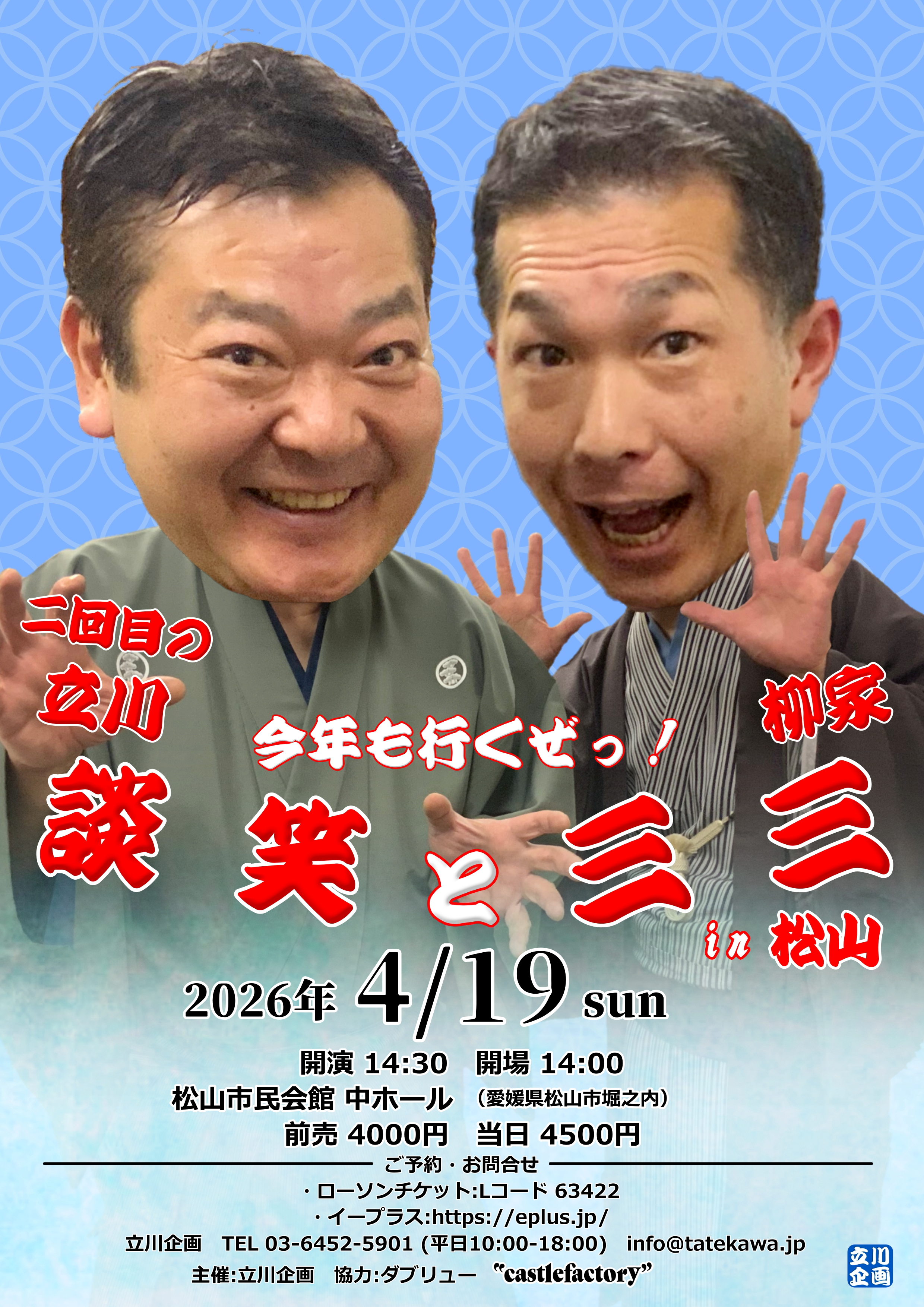 ・お問合せ スペース・ゼロ 03-3375-8741 (平日10:00~17:30)- 4月19日(日)「2回目の立川談笑と柳家三三 立川談笑・柳家三三 二人会」/愛媛・松山